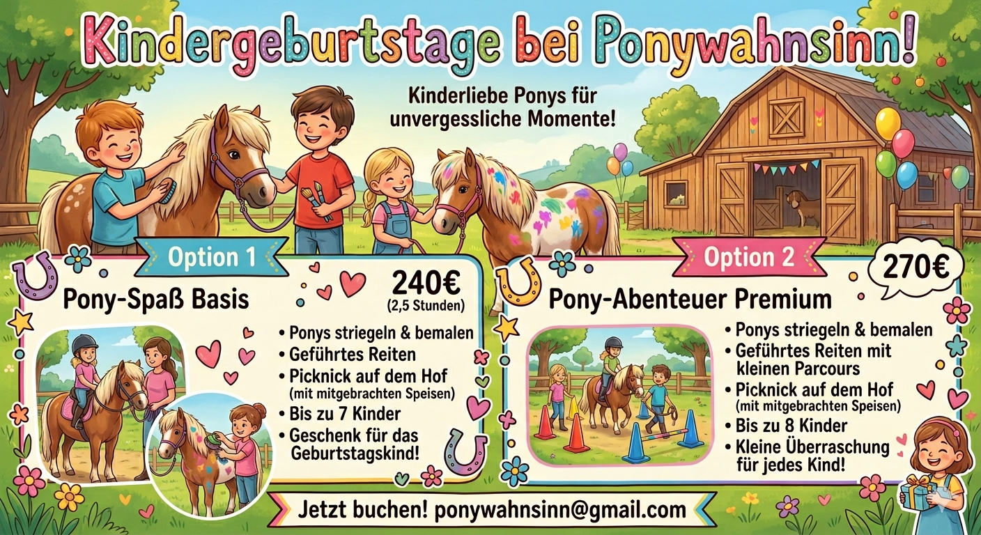 Erleben Sie unvergessliche Momente voller Freude und Abenteuer bei Ponywahnsinn . Wir schaffen magische Geburtstagsfeiern, die Kinderaugen zum Leuchten bringen. Entdecken Sie, wie wir Ihren besonderen Tag zu einem tierisch guten Erlebnis machen.