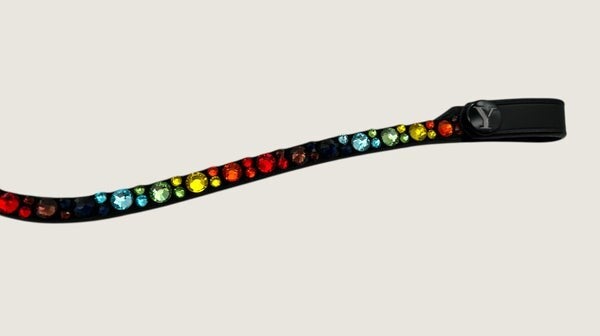 Funkelnder Strass Stirnriemen mit Swarovski Kristallen – Bringen Sie Glanz in das Reiterlebnis mit unserem neuen Strass Stirnriemen in der Farbe Rainbow. Erhältlich in verschiedenen Größen, bieten diese Stirnriemen nicht nur einen Hauch von Eleganz, sondern auch die Möglichkeit, das Equipment individuell zu gestalten.