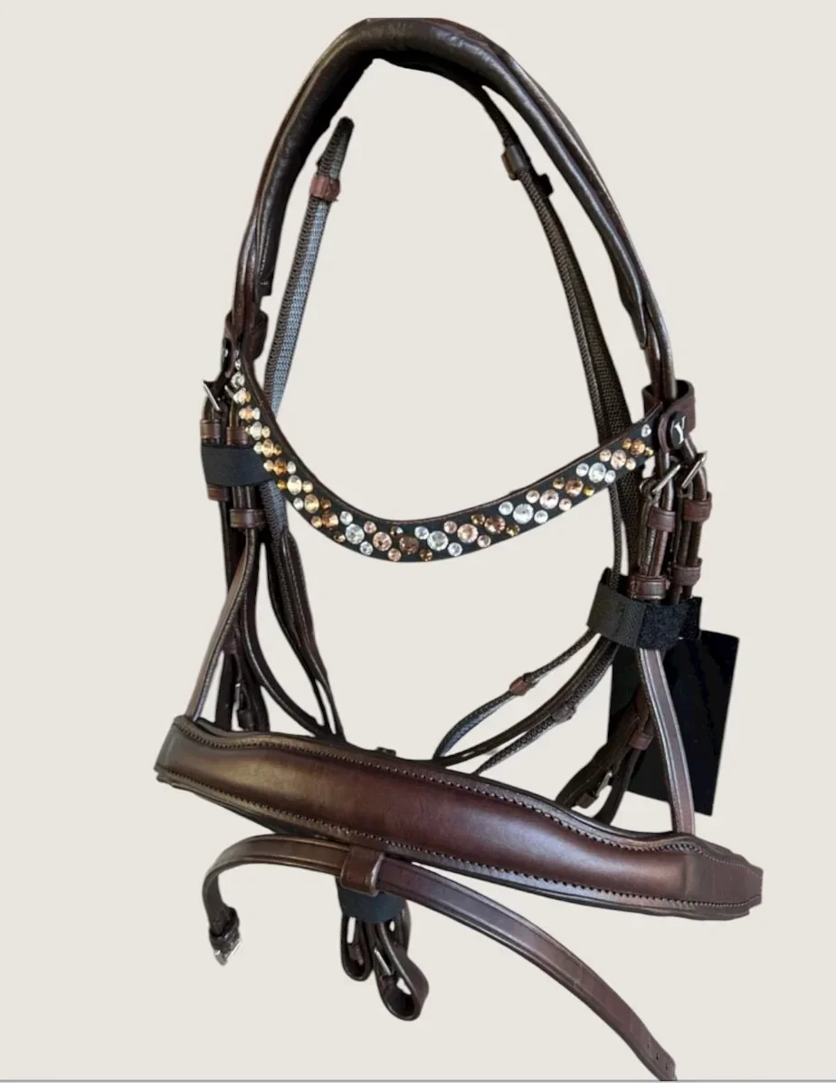 Besonders hervorzuheben ist der Stirnriemen, der mit funkelnden Swarovski-Steinen verziert ist und so einen Hauch von Glamour in die Reitausrüstung bringt. Diese Trense ist in verschiedenen Größen erhältlich: Shetty, Pony, Small Lager, Cob und Full, um optimal an die Bedürfnisse deines Ponys bzw. Pferdes angepasst zu werden.